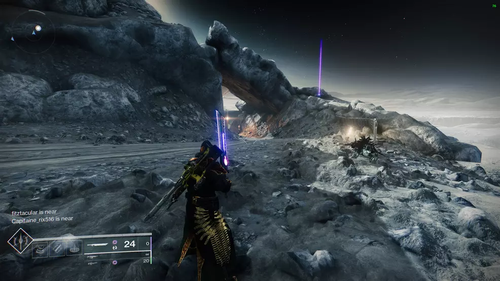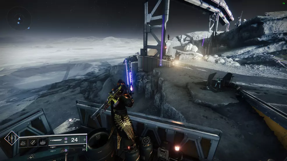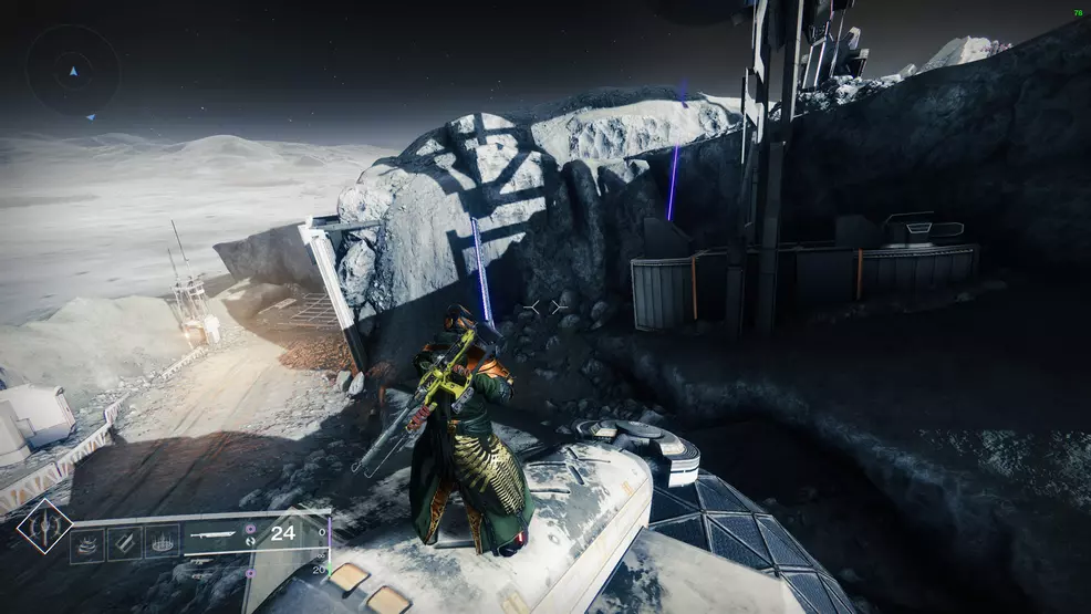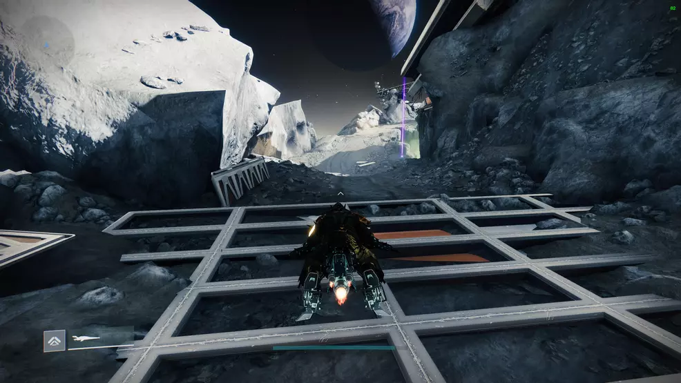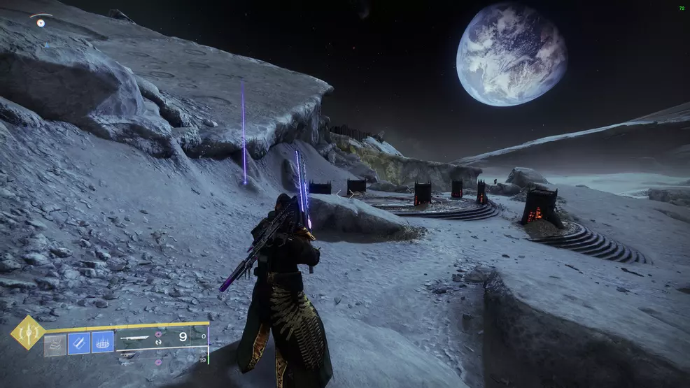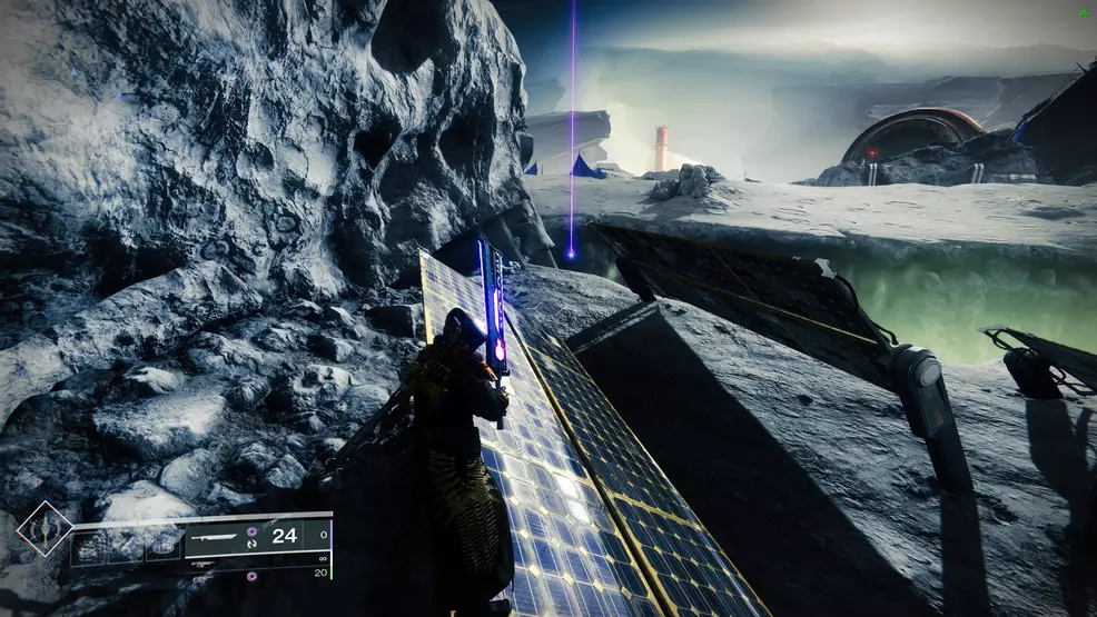 The first Ascendant Anchor on the Moon is to the left of the fast travel location. Follow the edge of the cliff to the purple beam of light to spot it.