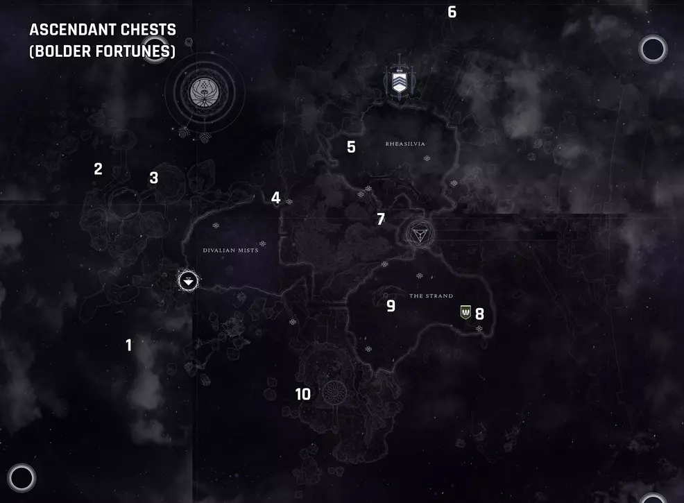 The first Ascendant Chest as part of the Bolder Fortunes collection can be found in the Lost Sector behind the fast travel point in Divalian Mists. Head into the Bay of Drowned Wishes and once out of the cave system, look across the foggy bay to the rock formation on the left. At the top of this hill is the Ascendant Chest.
