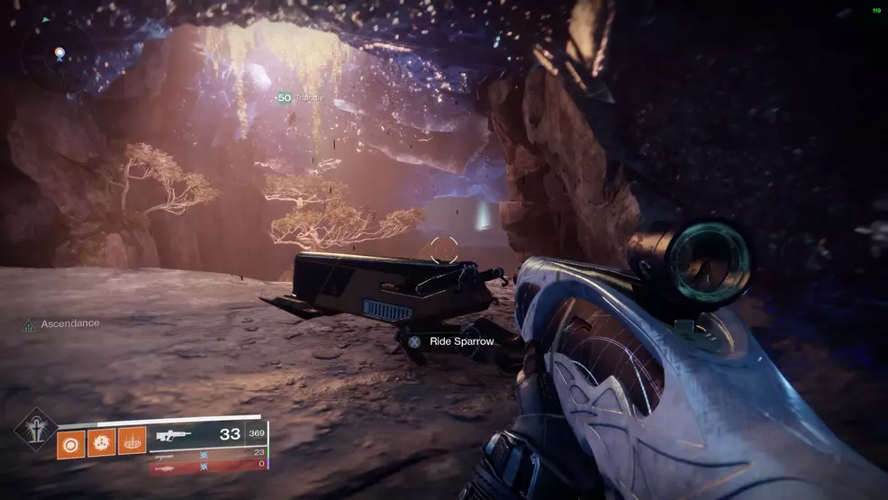 The third Ascendant Chest included in the Bolder Fortunes collection isn’t technically in the Spine of Keres, it’s actually in the Confluence, which can be accessed via any of the three Taken portals – this portal is just the closest. Start at the Divalian Mists, head through the blue crystal tunnel into the Spine of Keres and then cross the small arena toward the observatory. Instead of crossing the bridge, look over the right side to see a pathway leading down to a cave. Go through the portal and follow the hallways until you reach the Confluence. Find the platforms near the doorway leading to the large, black, cavernous room.