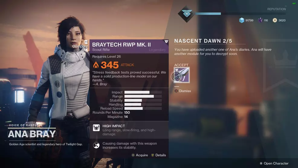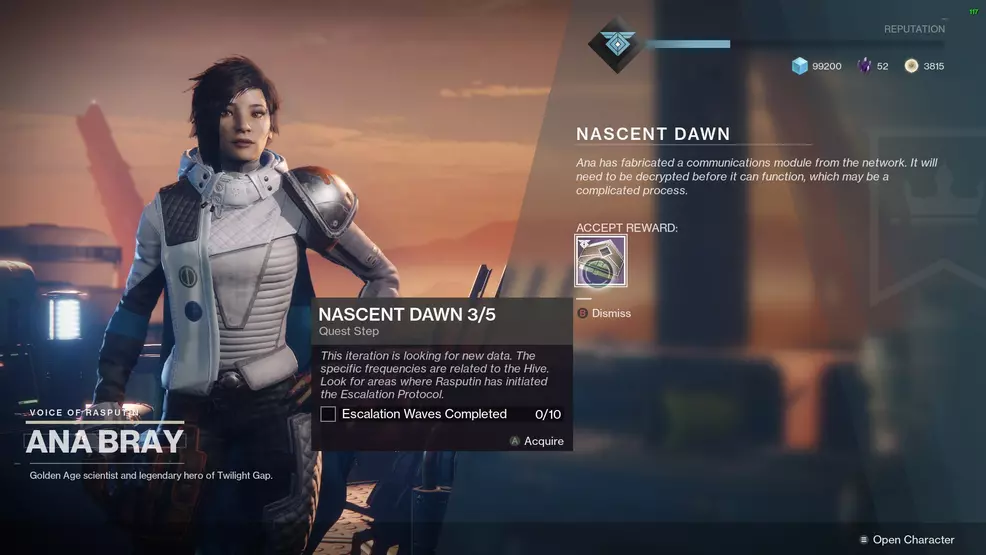 Each step of the Nascent Dawn quest is delivered to the player by Ana Bray at reset every week. Players will need to complete the previous week’s Nascent Dawn quest before beginning the next quest. A few of the steps require using the reward from the previous week, the Braytech RWP MK II scout rifle – if players have dismantled it, a spare one can be purchased from Ana Bray.