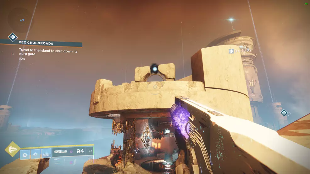 The second of Savathûn's Eyes in the Rupture is towards the south of the map, near the Aphix Conduit Lost Sector. Go up one of the ramps and turn around to see the eye tucked in some of the Vex blocks.