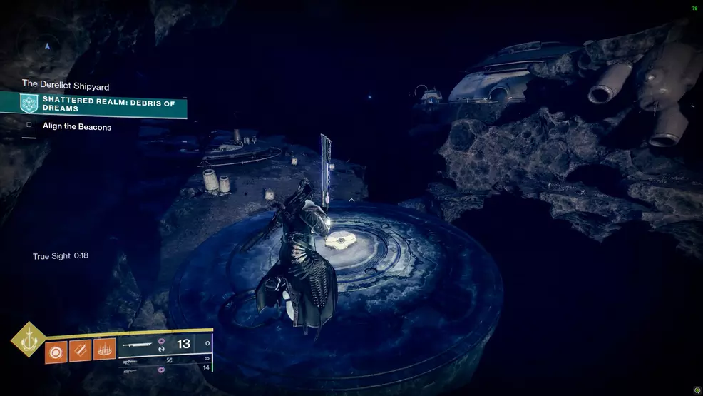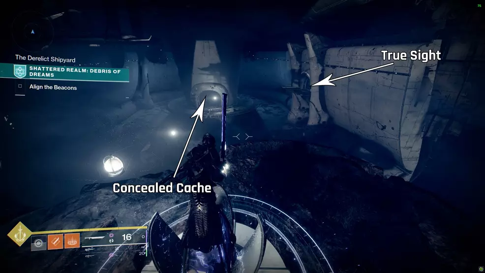 This Trivial Mystery is up the steep shaft near the second beacon. To get it you will need to use True Sight sign that is through a door on the right. Grab the True Sight from the ledge, run back into the shipyard and climb the steep shaft. At the top, turn right and run down the corridor to spot a chest near a floor with a barrier.