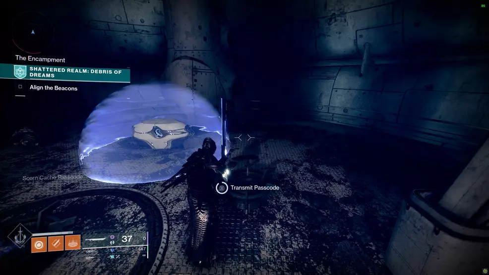 Near the second beacon, and up the shaft, will be a locked door you can now open. Inside is a Scorn boss and some enemies you must defeat. There will be a chest behind a shield that requires three codes to unlock. The first code you’ll get from the Scorn in the same room.