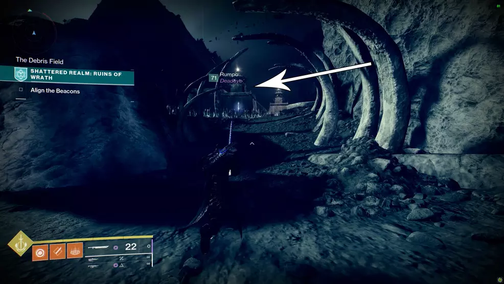This Trivial Mystery is to the right of the first beacon, past the Hive portal and to the right of the Debris Field. Jump across the floating rocks, sticking to the right-hand side, and jump up to the higher level. There will be the ribcage head of you, don’t go towards it. Turn right and drop down to the ledge, grab the Barrier Breach and walk up the tunnel to find a tiny cave.