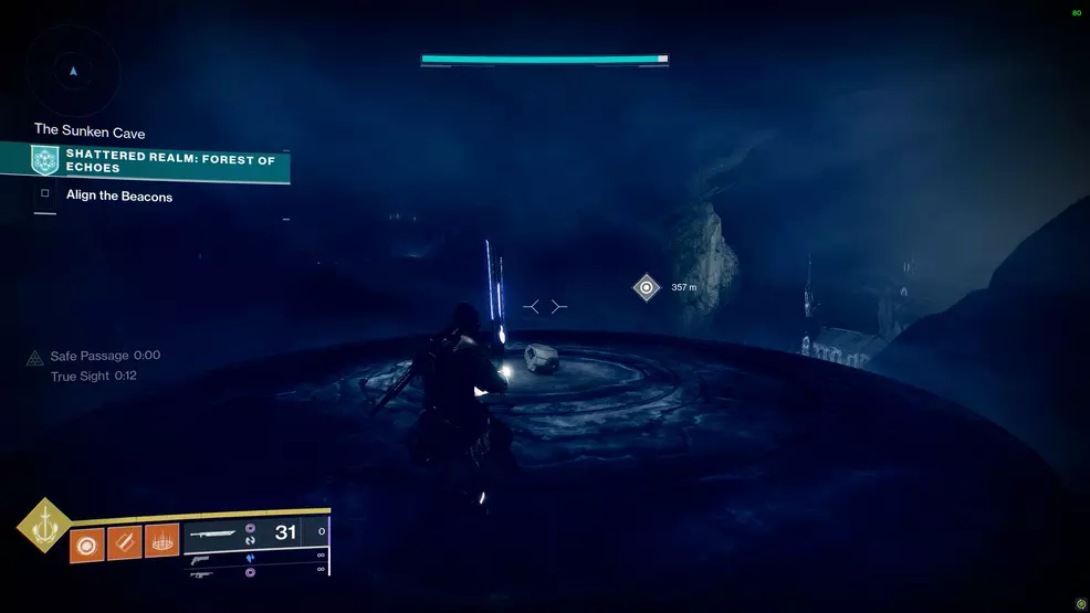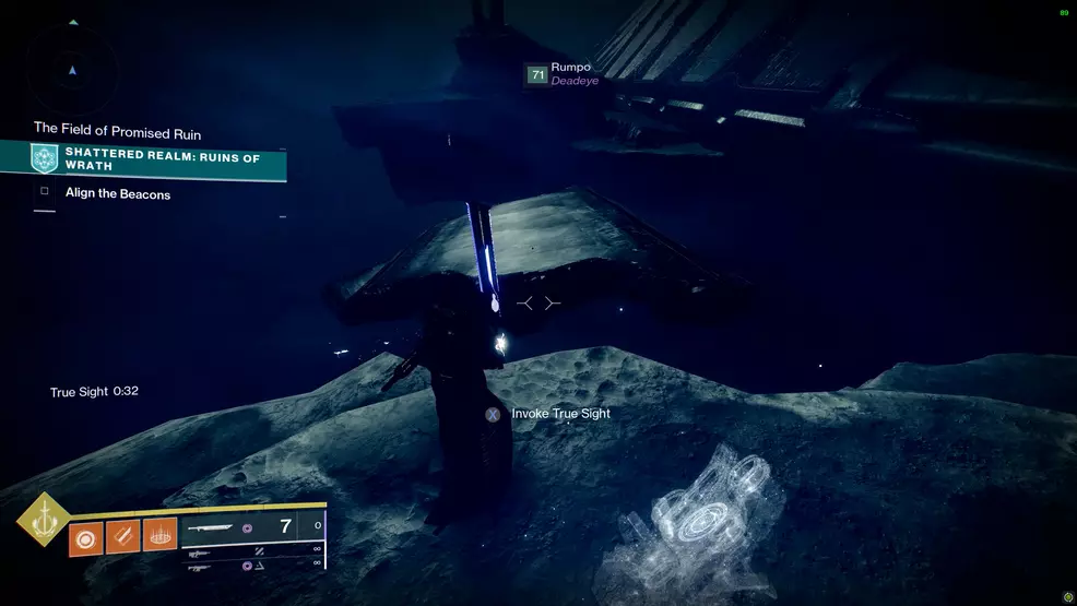This Trivial Mystery is found from the first beacon. Turn around (towards the entrance of the realm) and use the True Sight post to make some platforms and the chest appear.