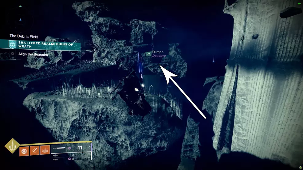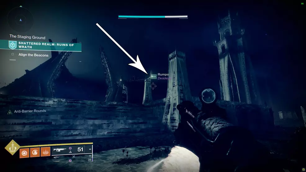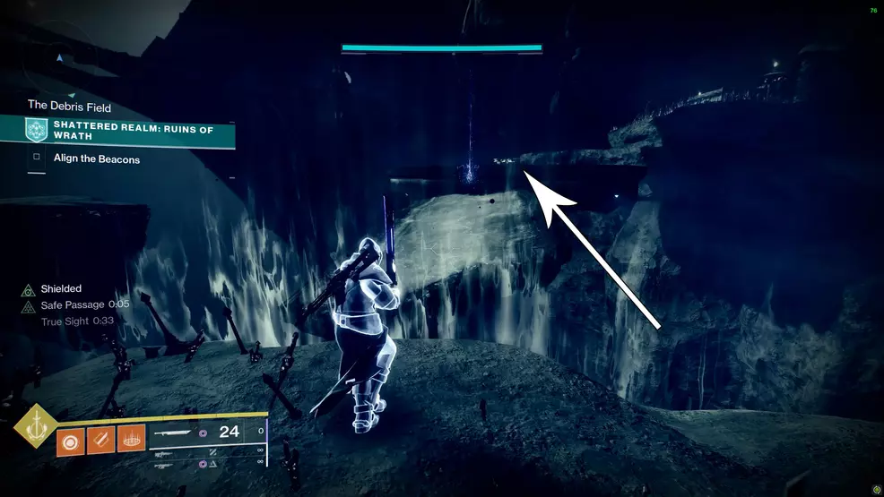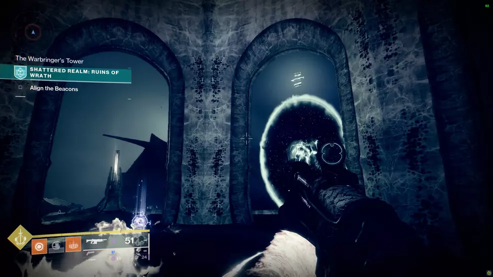 This is one of the first Enigmatic Mysteries you could acquire. This one is found below the final boss arena and can be accessed by jumping over the railing. To reach it, start at the second beacon and climb the steep shaft. Turn left at the top of the shaft and use the Fallen teleporter on the ledge. On the other side, run across to the railing and look down to see an Ascendant Anchor. Jump down to the ledge, use the True Sight, and grab the chest.