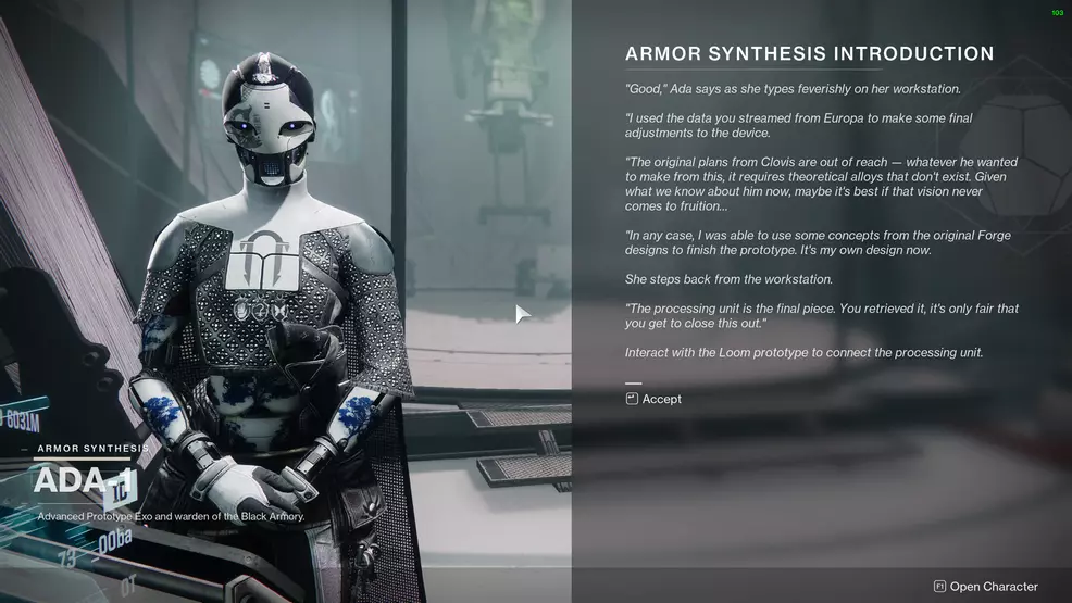 The first step in the Armor Synthesis Introduction quest is to visit Banshee-44, he’ll tell you to go speak to Ada-1.