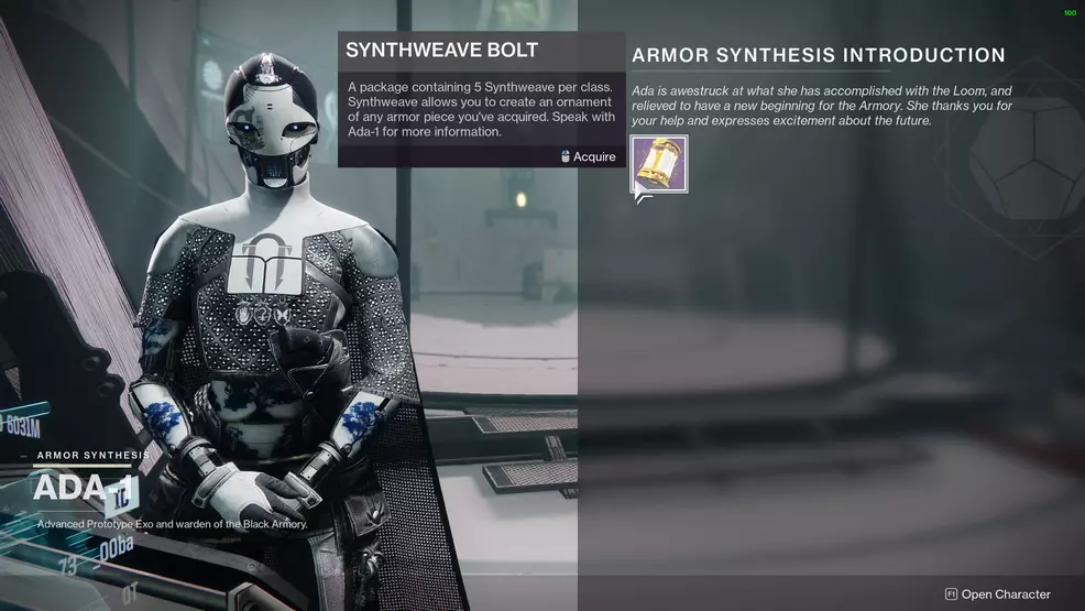 With the Loom completed, speak with Ada-1. After her speech, she will reward you with a Synthweave Bolt, which contains 5 Synthweave per class.