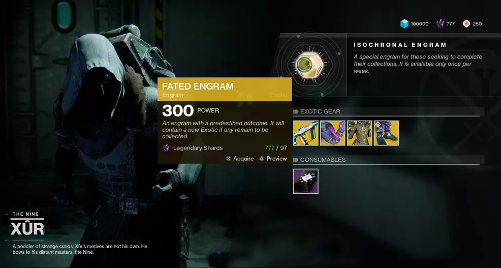 The Fated Engram is an Exotic Engram that will set you back 97 Legendary Shards and will decrypt as an Exotic you do not own – no more duplicates! The Three of Coins is a booster that increases your chances of receiving an Exotic Engram from drops for four hours.