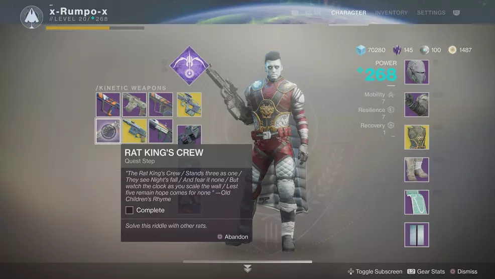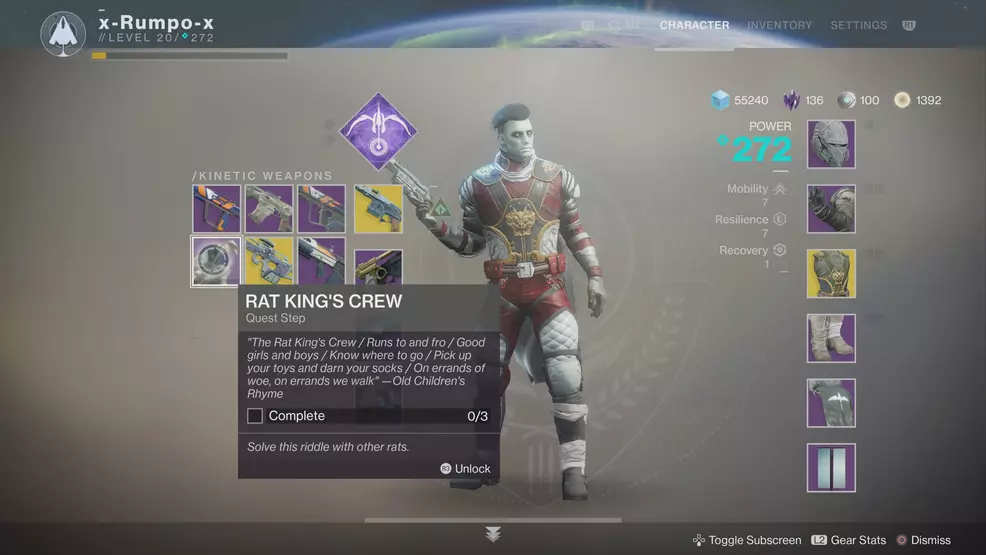 Once the story is done and you’re happy with your Power level, head to Titan and look for a quest called Enemy of my Enemy. It’s a multi-mission quest, but it isn’t overly difficult to complete. Once you’re done, you will receive an item in your kinetic weapon slot called Rat King’s Crew, and it’s a little vague on what you need to do.