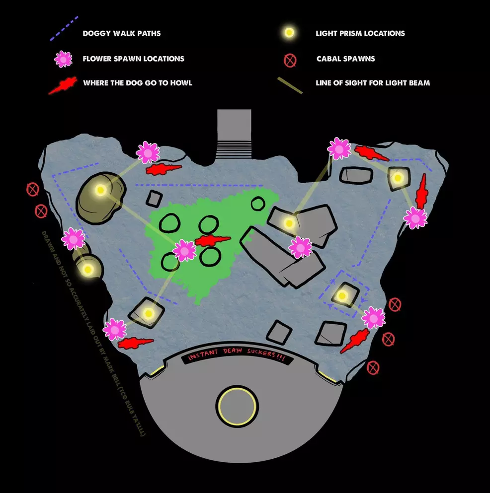 The goal of the Gauntlet is to take Psionic Charges through an obstacle course and place them in a statue in the middle. Two members of your team will be chosen as course runners, and typically this would be the two lowest Power level Guardians you have, allowing the higher Power level Guardians to stay outside and do the shooting, where their Power is put to good use. Of course, you must make sure that the course runners are trustworthy and agile, so consider carefully. While the course runners are inside the obstacle course, four members of your fireteam will be outside and standing on pillars. Each pillar will have one of the four symbols: Sun, War Dog/Dog, Axes and Chalice/Cup.