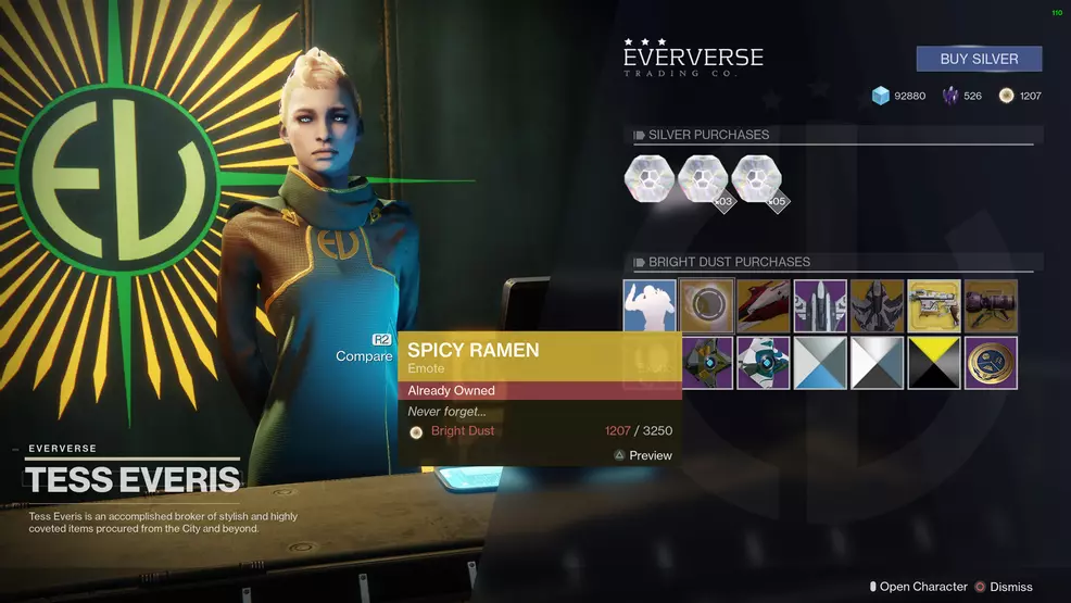 The Spicy Ramen emote is an exotic emote in Destiny 2. It can drop in a Bright Engram that you earn for leveling up, or it can be purchased directly from Tess Everis if she happens to be selling it. While the odds of it dropping in a Bright Engram aren’t great, Tess Everis is selling this exotic emote for the next week (November 21 to November 27). If you wish to buy it directly, it will cost you 3,250 Bright Dust.