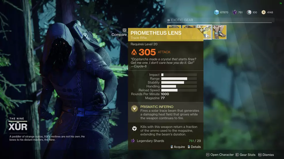 Xur is back for the first time since the Curse of Osiris released, and everyone in the world was hoping that he’d bring the very broken Prometheus Lens exotic trace rifle. Well, good news, Guardians, because the PvP is about to be as broken as imaginable until the Prometheus Lens is patched next week.