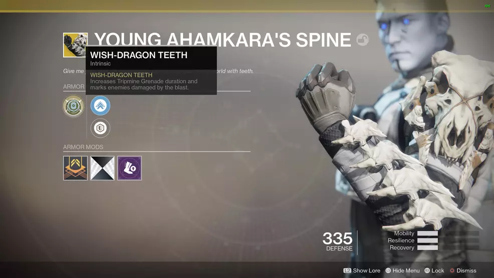 The intrinsic perk for Young Ahamkara’s Spine is called Wish-Dragon Teeth. This increases your Tripmine grenade duration and marks enemies that are damaged by the blast. The Tripmine grenade, however, ranks 15 out of 25 in terms of single target damage potential. Since nothing in the intrinsic perk mentions an increase in damage, it’s safe to assume that its killing potential doesn’t increase, aside from the fact it remains in play longer. You’d be hard pressed to kill another play in the Crucible with one of these unless everything went in your favor, which is rarely the case.