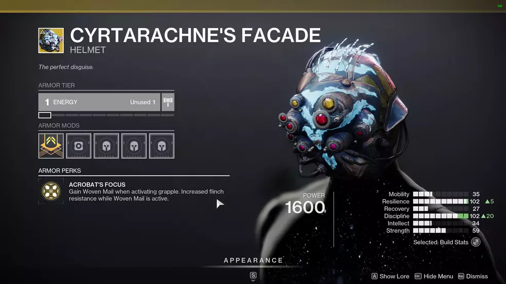 Intrinsic Perk: Acrobat's Focus - Gain Woven Mail when activating grapple. Increased flinch resistance while Woven Mail is active.
