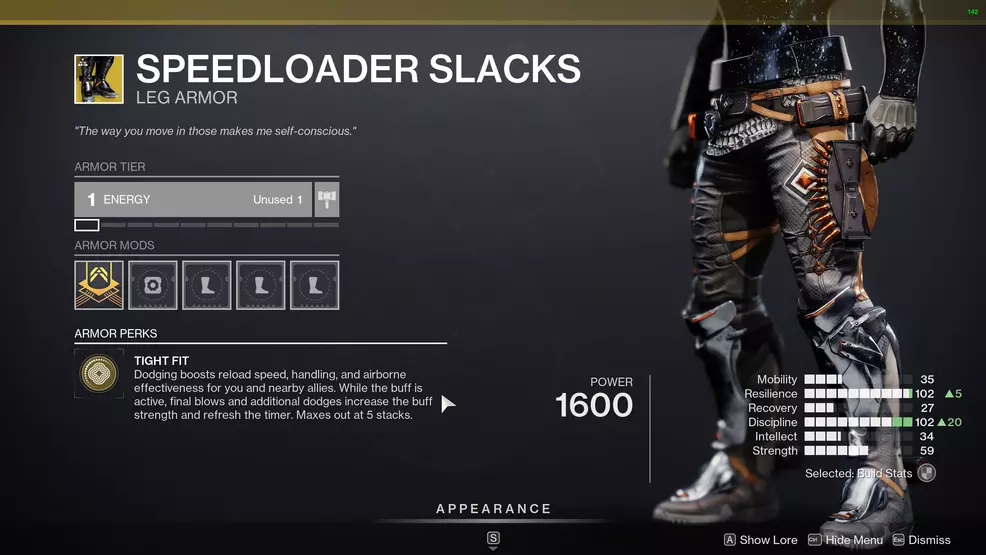Intrinsic Perk: Tight Fit - Dodging boosts reload speed, handling, and airborne effectiveness for you and nearby allies. While the buff is active, final blows and additional dodges increase the buff strength and refresh the timer. Maxes out at 5 stacks.