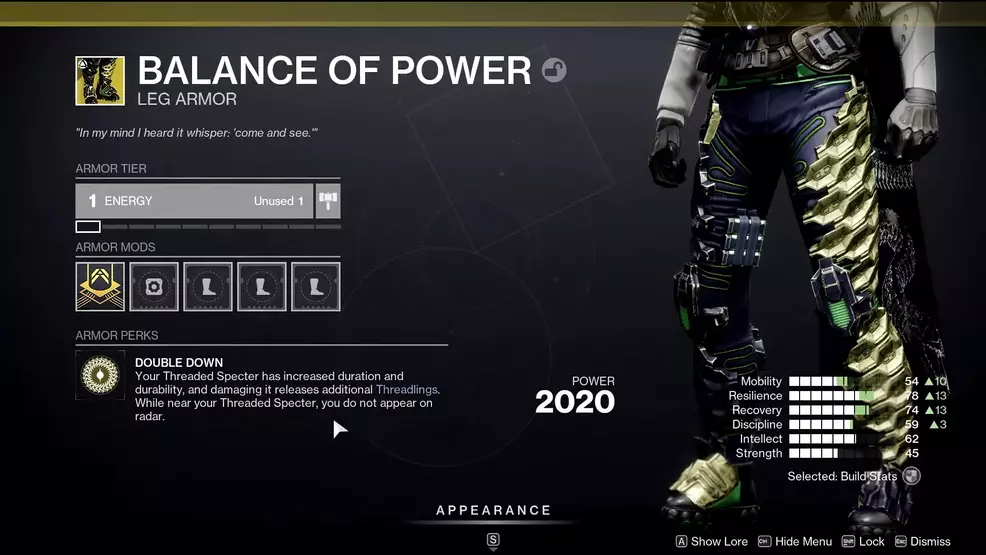 Intrinsic Perk: Double Down: Your Threaded Specter has increased duration and durability, and damaging it releases additional Threadlings. While near your Threaded Specter, you do not appear on radar.