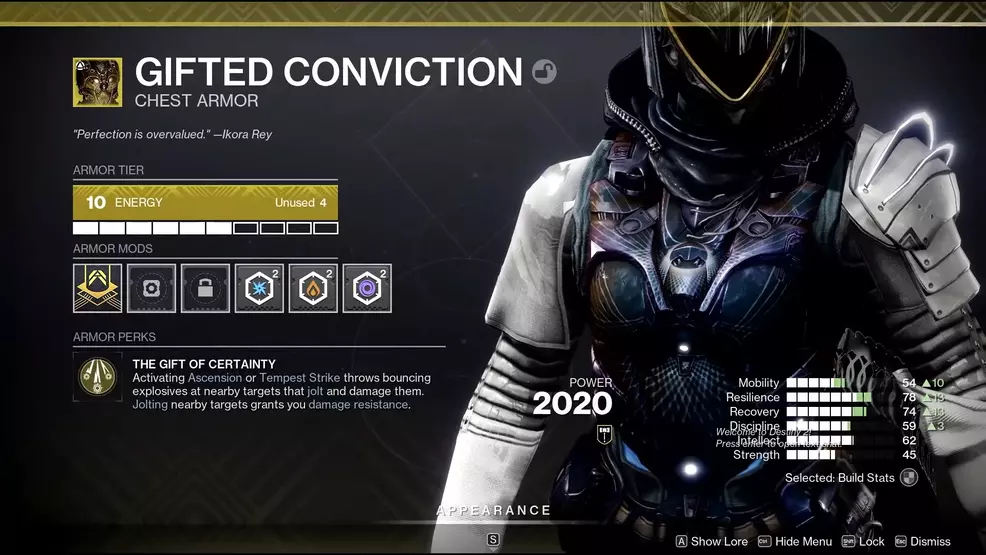 Intrinsic Perk: The Gift of Certainty: Activating Ascension of Tempest Strike throws bouncing explosives at nearby targets that jolt and damage them. Jolting nearby targets grants you damage resistance.