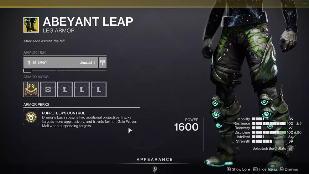 Intrinsic Perk: Puppeteer's Control - Drengr's Lash spawns two additional projectiles, tracks targets more aggressively, and travels farther. Gain Woven Mail when suspending targets.