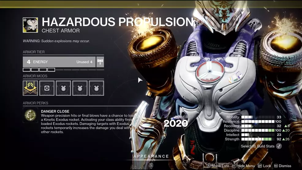 Intrinsic Perk: Danger Close: Weapon precision hits or final blows have a chance to load a Kinetic Exodus rocket. Activating your class ability fires loaded Exodus rockets. Damaging targets with Exodus rockets temporarily increases the damage you deal with al lother rockets.