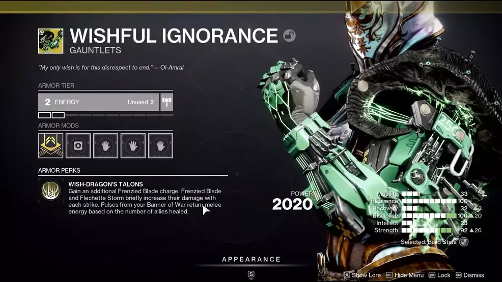 Intrinsic Perk: Wish-Dragon's Talons: Gain an additional Frenzied Blade charge. Frenzied Blade and Flechette Storm briefly increase their damage with each strike. Pulses from your Banner of War return melee energy based on the number of allies healed.