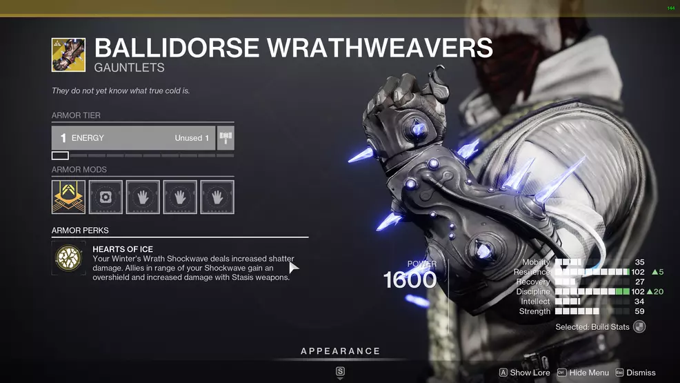Intrinsic Perk: Heart of Ice - Your Winter's Wrath Shockwave deals increased shattered damage. Allies in range of your Shockwave gain an overshield and increased damage with Stasis weapons.