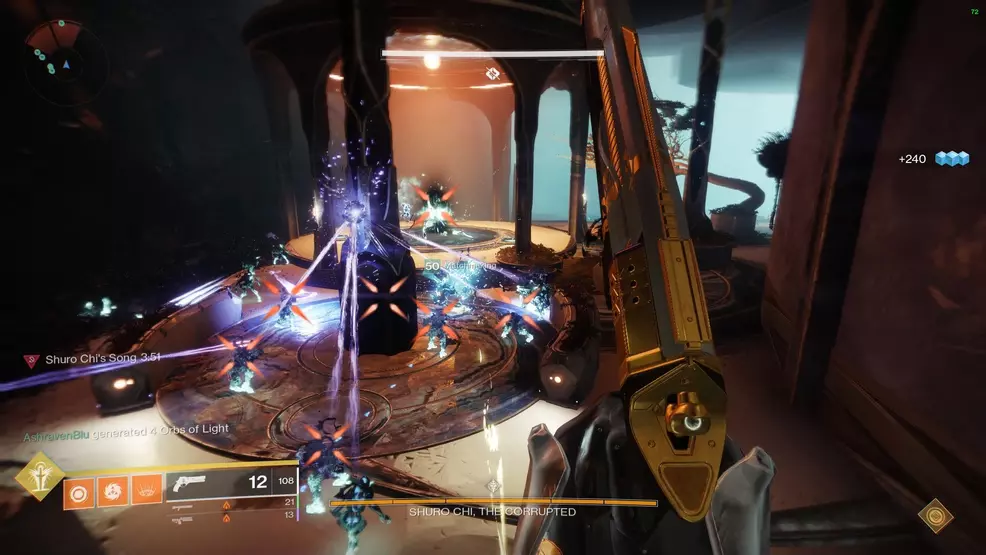 Once the Prism Weapons spawn, Shuro Chi will fasten the rate at which the timer counts down until her shield is removed. The faster players remove her shield, the more time is saved. With her shield down, players need to deal enough damage to remove one segment of her health bar. After a few seconds Shuro Chi will begin a wipe mechanic, at which point the player holding the Eye of Riven will need to fire the Super at her, interrupting the wipe. At this point, players will have one chance to finish removing the segment of health before she does another wipe attempt. With the health segment removed, Shuro Chi will move along to the next area.