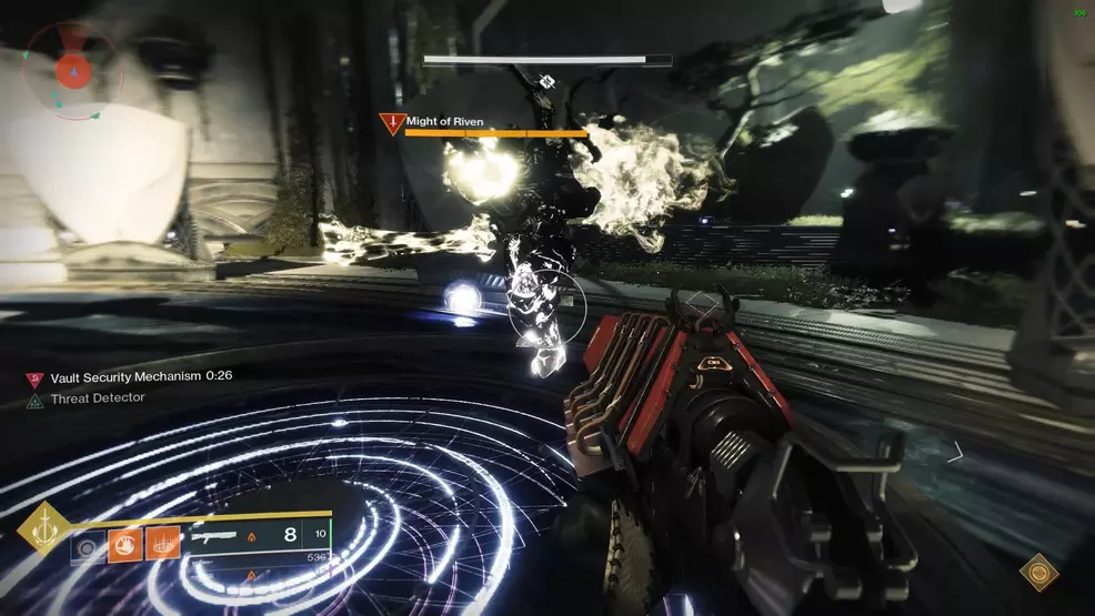 The fight begins (and the 4 minute timer will start counting down) once the door opens. Clear the adds inside and push up to the pergola/stage. A special Taken Captain called Eye of Riven will spawn, killing it drops an Eye of Riven, a Taken weapon that is used to interrupt Shuro Chi’s team-wipe attack. It's important to note that after picking up and using the Eye of Riven, the player will be given a debuff that prevents them picking up another Eye of Riven for 90 seconds. Another player will have to take the role of using the Eye of Riven to interrupt Shuro Chi's attack.