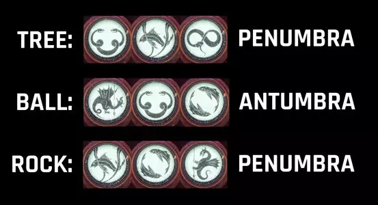 The main difficulty of this fight will be wrapping your head around how the symbols work. Here’s an example of the symbols players might see when standing on their locks. Tree has the up snake duplicate of ball on the left, so it requires Penumbra. Ball has the double fish symbol of rock on the right, so it needs an Antumbra. Rock has the seaweed fish duplicate of tree on the left, so it needs a Penumbra.