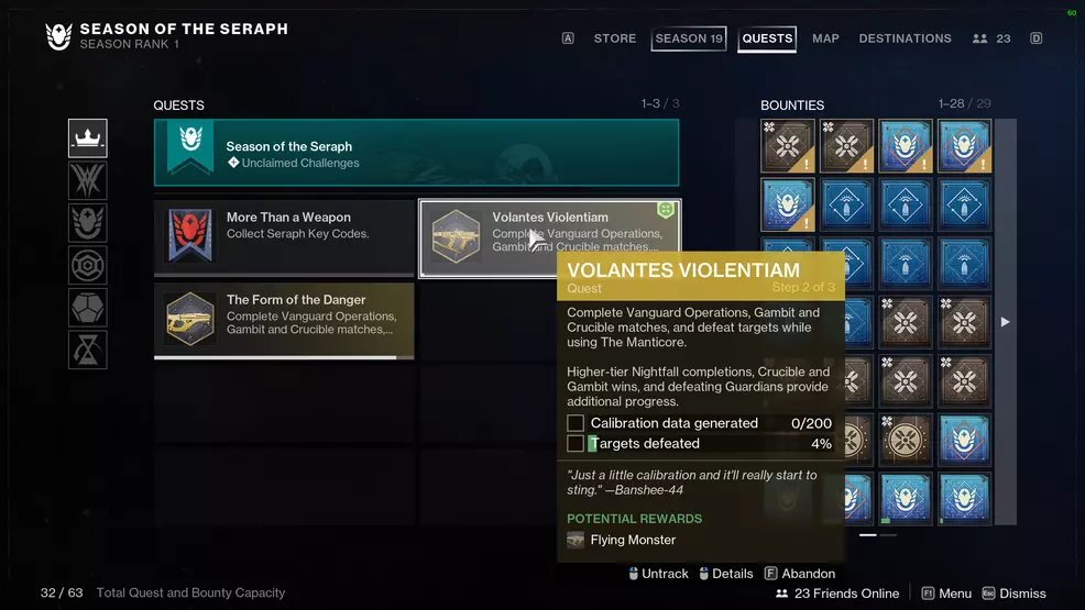 Volantes Violentiam is a quest included with Season of the Seraph to unlock the Manticore Exotic catalyst. Much like other catalyst quests, this one requires players use the new seasonal Exotic weapon and then charge it up by getting kills.