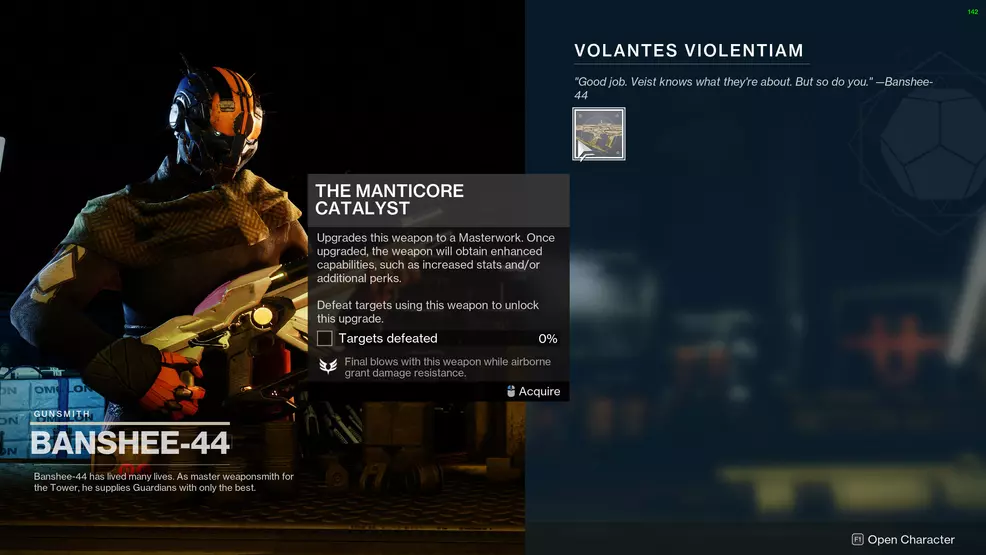 With the quest completed, you will unlock the Manticore Exotic catalyst. All you need to do now is get kills with the gun to actually complete the masterwork. Once that is done, the gun can have its Exotic catalyst applied, which will add the Flying Monster perk. This grants damage resistance when you get final blows while airborne.