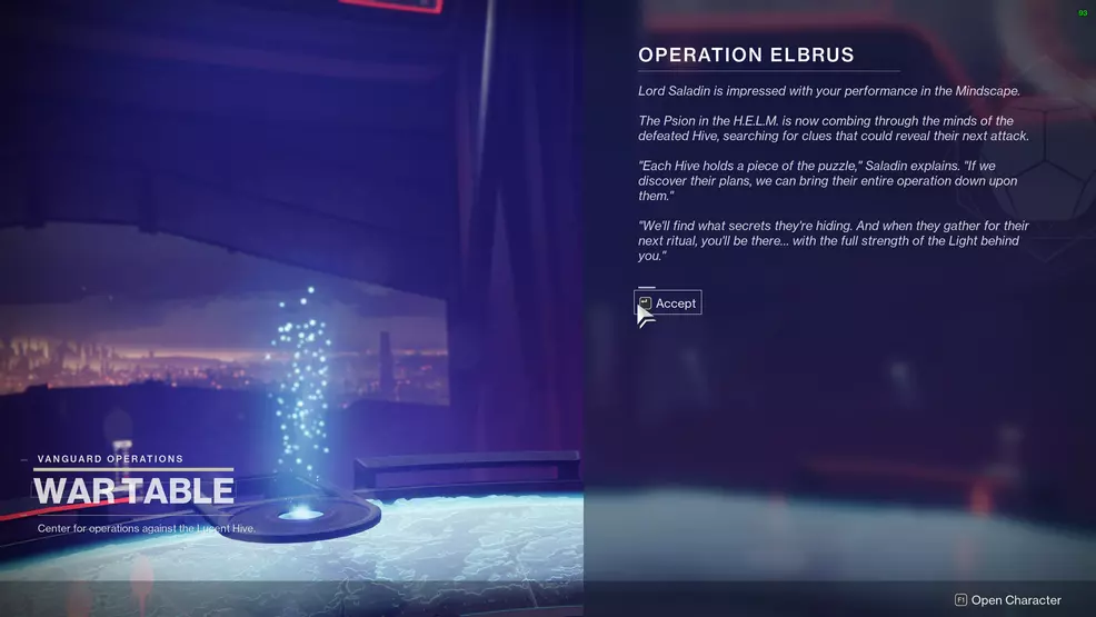 The first step of this week's Operation Elbrus questline is to head to the H.E.L.M., visit the War Table, and listen to a briefing from Lord Saladin. Load into the H.E.L.M. via the icon just above the Tower in your Director and do just that.