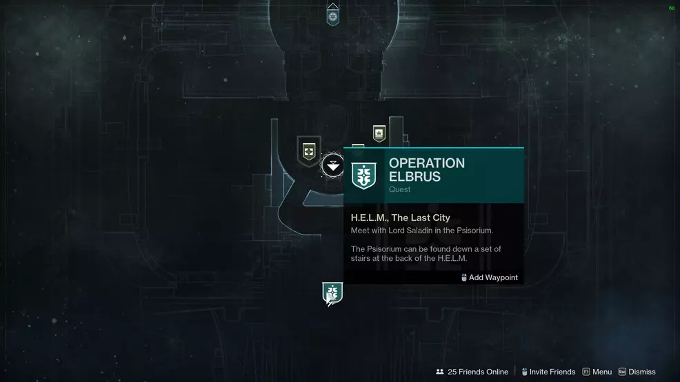 A new area in the H.E.L.M. will now be available. Visit the Psisorium to continue the Operation Elbrus Part 2 questline. It can be found down the stairs behind where you spawn in. Listen to Saladin and Crow.