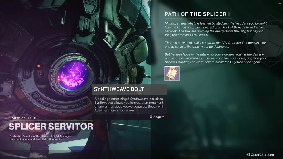 Now step over to the Splicer Servitor and chat with Mithrax. You will receive a Synthweave Bolt and a bunch of other resources.