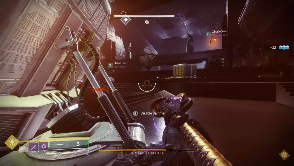The exception to the standard exploration with occasional fighting routine occurs when you meet the Imperial Deserter, a boss that teaches you this mission's main mechanic. This boss will have three sections to their health bar and, to lower their shield and enter a damage phase, players must find a console in the room.