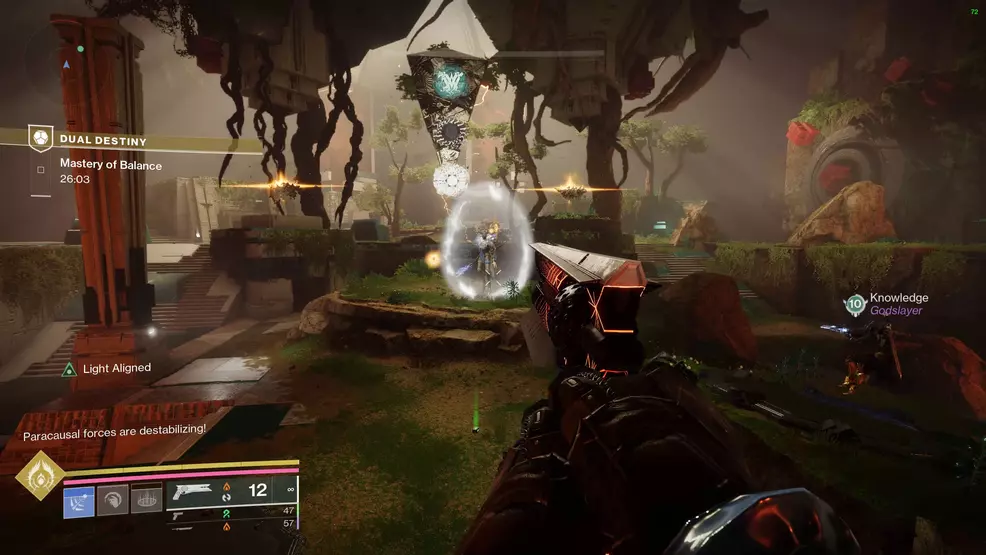 - Shooting the incorrect node will display the following text: Light and Darkness fall out of balance. Your empowerment fades!