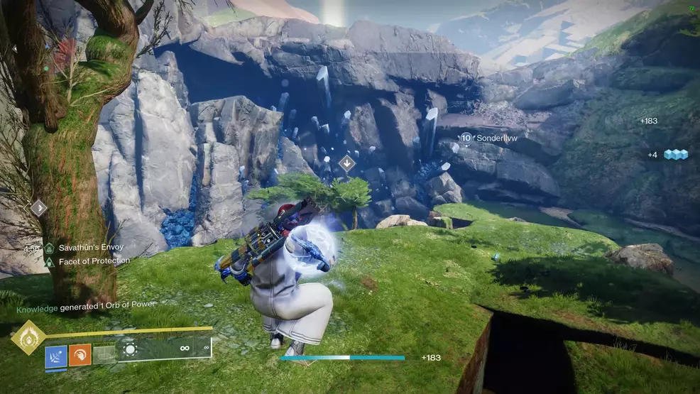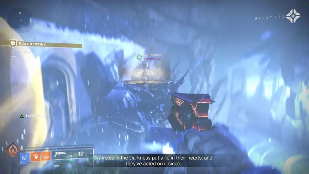 Once inside the cave, approach the statue of Savathun and a few things will happen: Savathun will cackle, you will see on-screen text that says “A strange energy washes over you…”, you’ll get a 7 minute buff called Savathun’s Envoy, and two nodes will appear on your HUD (two halves of an icon).