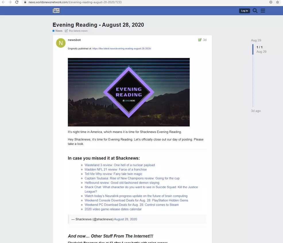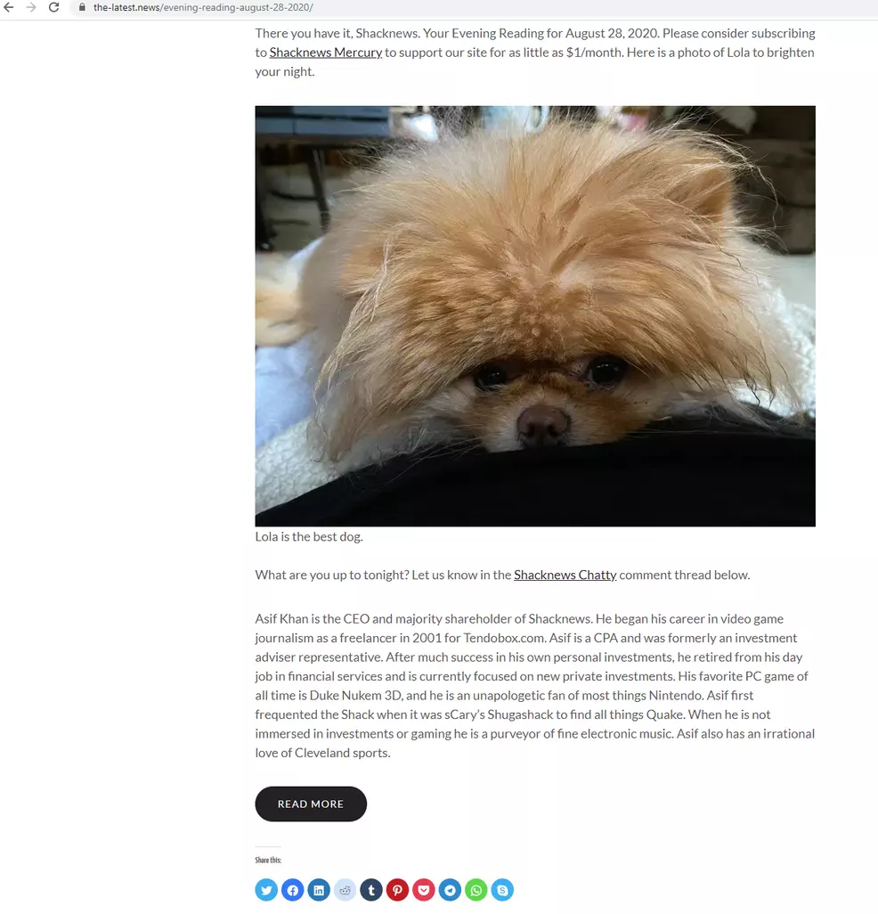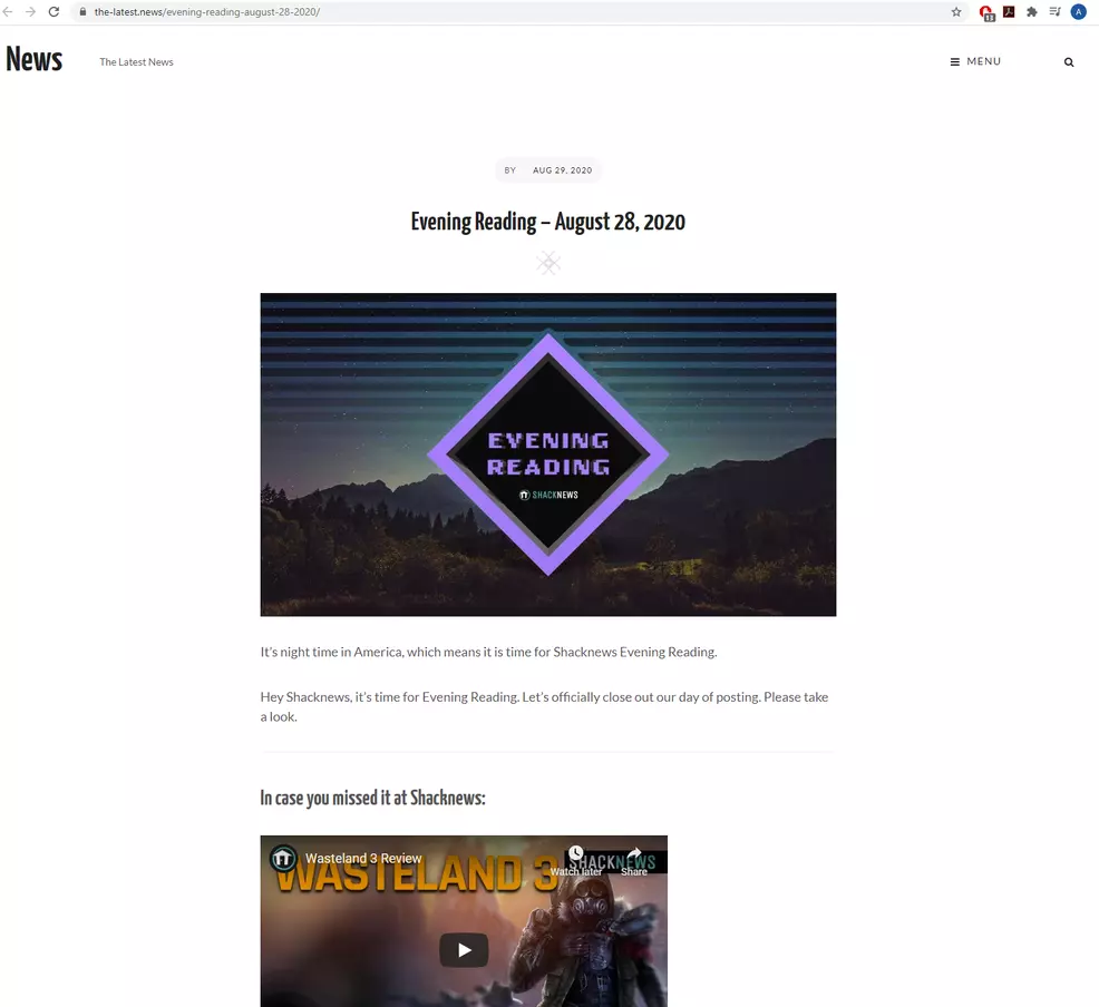 I have to break our usual format tonight, because I noticed something terrible today when looking for a Shacknews image on Google. the-latest.news has been stealing Shacknews Evening Reading! This article already gets pitiful pageviews when compared to other articles here, so this is a huge deal. Screw these guys. I am going to troll them right here, and their dumb bot is going to scrape all of this and repost it. Join me!