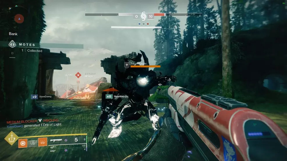Summoning a blocker isn’t the only benefit of depositing motes. Once 25 and 50 motes are deposited, a player can invade their opponent’s arena, adding a little bit of chaos to the match. After the allotted motes are banked, a portal near the bank will open, allowing one player to invade the opposing team’s arena. This player will be able to see where their enemies are, how many motes they’re carrying, will not be targeted by any AI-units, and will have an overshield. The invader won’t be in the arena indefinitely, they’ll be sent home after 30 seconds or 4 kills, whichever happens first.
