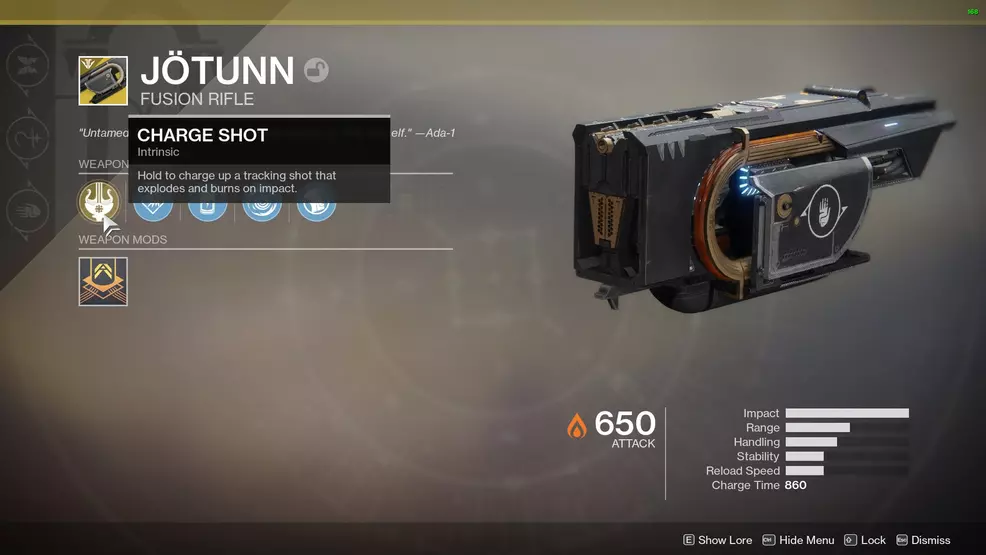 Jotunn’s main appeal comes from its Intrinsic perk, Charge Shot. Hold fire to charge up a tracking shot that explodes and burns on impact. The tracking of this projectile is only slightly aggressive, nowhere near as devastating as Truth from Destiny. Players who have an ounce of warning will be able to easily side step the bolt before it hits them. However, if a shot from Jotunn does connect, the impact damage and following burn is enough to kill a player in one shot.
