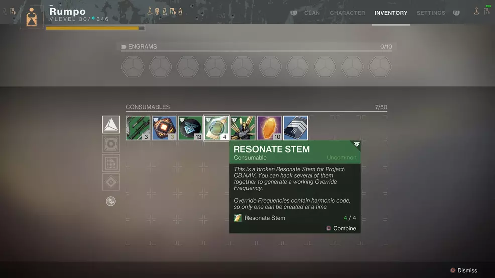 Resonate Stem doesn’t appear to be available until players progress through the main story of Warmind and complete a couple world quests that lead to the IKELOS_HC_V.1.0.1 legendary hand cannon. After which, a quest step called Nascent Dawn 1/5 is received. This requires Guardians to complete three patrols on Mars, and then loot a lost sector on Mars. Following these actions players will get a message at the bottom of their screen under the heading Project: CB.NAV stating that, “You’ve acquired enough Resonate Stems to make an Override Frequency. Open your inventory to generate one.”