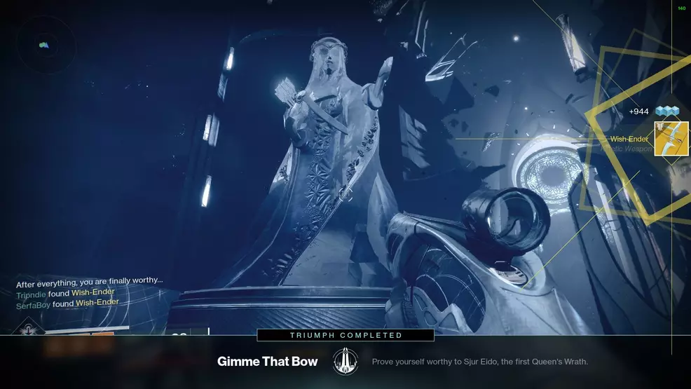 Though you’ve technically got Wish-Ender, the Hunter’s Remembrance quest isn’t finished just yet. Return to Petra Venj and show her the Exotic Bow. Once this is done, the quest is completed, and you can use this thing to take down Champions and destroy all the Corrupted Eggs.