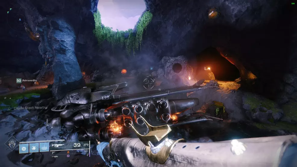 Cayde’s cache on the Tangled Shore is deep within the Jetsam of Saturn area, far down a cave system. Start at Thieves’ Landing and head left through the passage toward Jetsam of Saturn. When entering the ship area, stick to the left to enter the wreckage and go up a small hilly ramp, then turn left again to find an entrance to a tunnel. Pass through the tunnel system to discover several lush green caves full of Hive and some orange Hive-infested areas. At the end of this section is a crashed Fallen Skiff, behind it is Cayde’s chest.