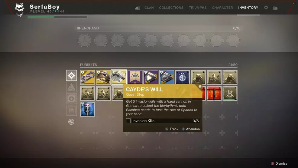 To unlock the Ace of Spades, players will need to complete the quest, Cayde’s Will, a multi-step quest given to the player by Banshee-44, the Gunsmith, at the beginning of the Destiny 2: Forsaken campaign. With the quest received, there are several other steps before players can begin using this powerful Exotic hand cannon.