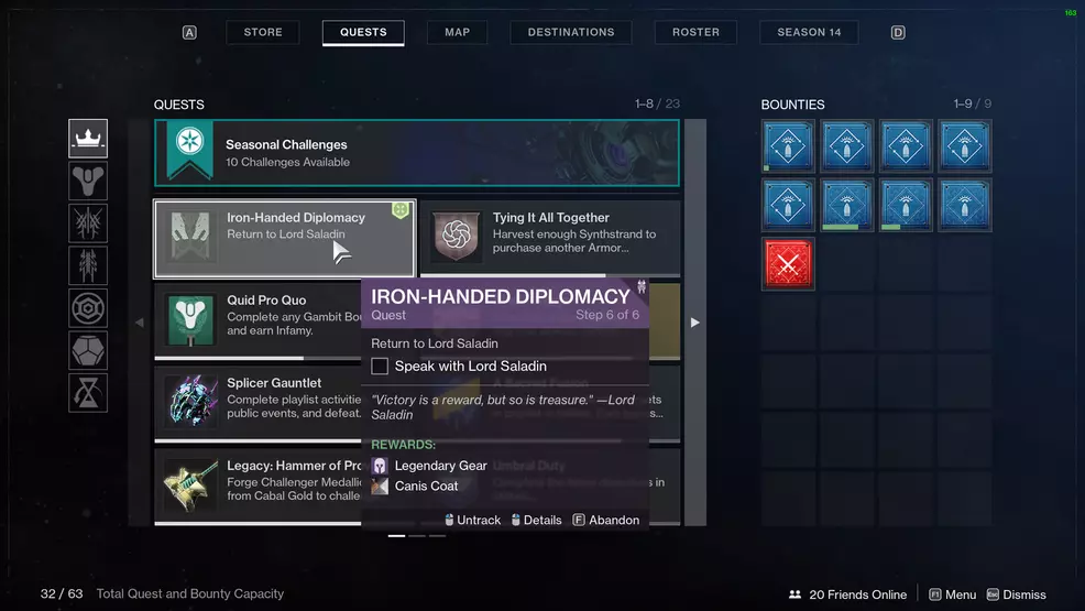 Head back to the Tower and chat with Lord Saladin to finish the Iron Banner Season 14 quest, Iron-Handed Diplomacy.