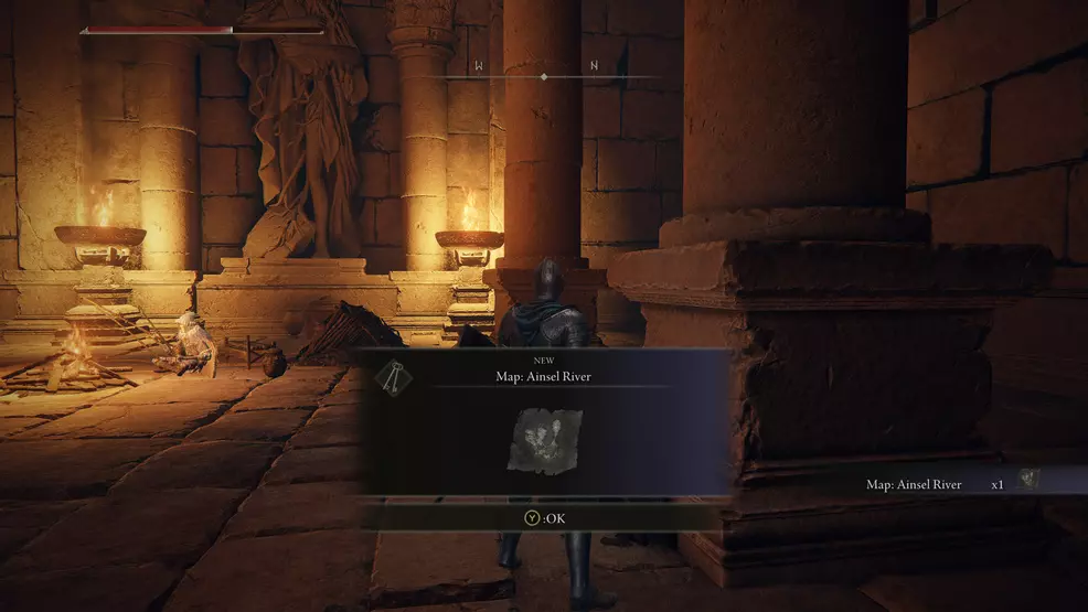 The Ainsel River map is a fair distance into the area. From the elevator in Mistwood, follow the river south and go through the building that is defended by a lot of enemies. In this next area, go into the large central building where you’ll find a merchant. The map is on a body resting against a pillar.