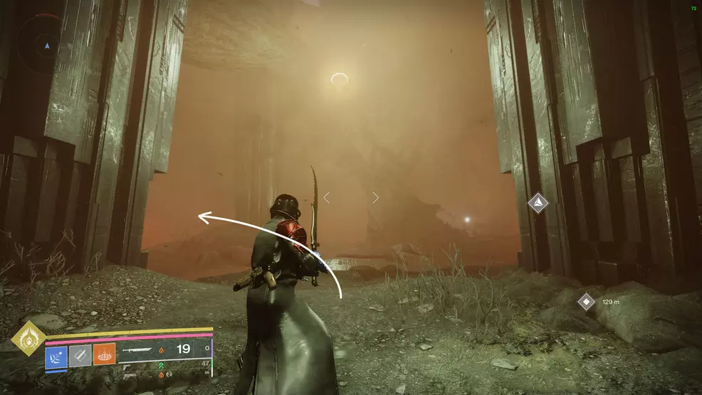 You’ll be in another outdoor area with some dark, blocky structures on your left and right. Continue forward to see the adjacent area that has large pillars with a circular light hovering in the middle. Behind the pillar on the left is a red light and some trees. Behind the tree is the Traveler orb.