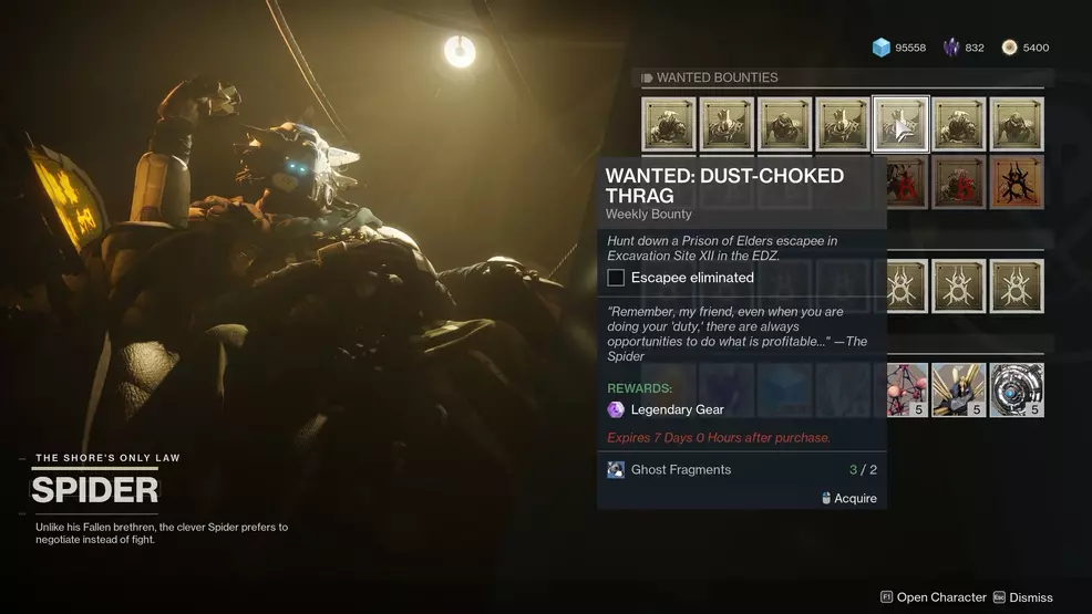Each week the Spider will roll out a collection of Wanted bounties for Guardians to track down escaped Prison of Elders inmates. Some will reward Powerful gear, and others will be more for your Triumphs. In the case of the Dust-Choked Thrag hiding out in Excavation Site XII in the EDZ, it’s more for the Triumphs. Still, Cayde-6 died fighting in the Prison of Elders, and revenge must be had, over and over and with no real end in sight.