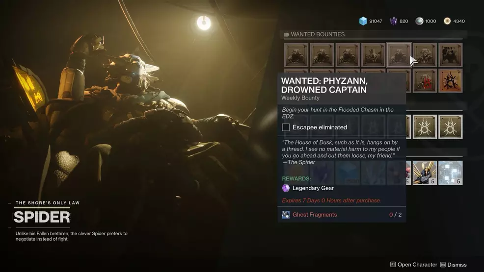 Each week the Spider offers up bounties on Wanted targets that escaped the Prison of Elders. Today, I’m going to give you the location of Phyzann, Drowned Captain. This Fallen Captain is hiding out in the lost sector known as the Flooded Chasm, part of the Winding Cove region of the EDZ. Hunt and eliminate this target to claim the rewards from the Wanted bounty.