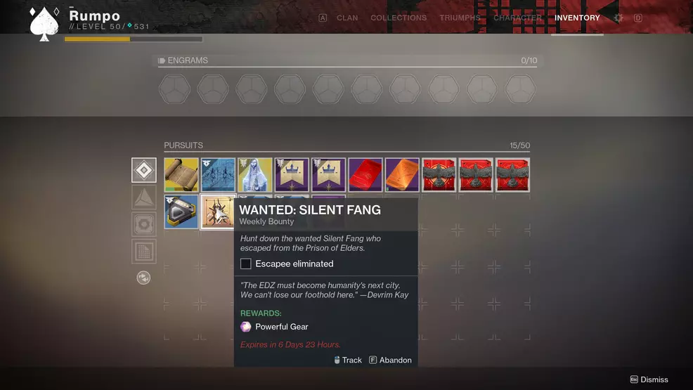 Each week the Spider offers up a handful of bounties for Guardians to complete, requiring them to hunt escapees from the Prison of Elders. Some of these bounties are found in lost sectors, some are done through normal exploration, and each week one Wanted bounty is completed through a heroic adventure at Power level 540. The Silent Fang, the Spider’s latest bounty offering Powerful gear, will be a challenge for even veteran Guardians.